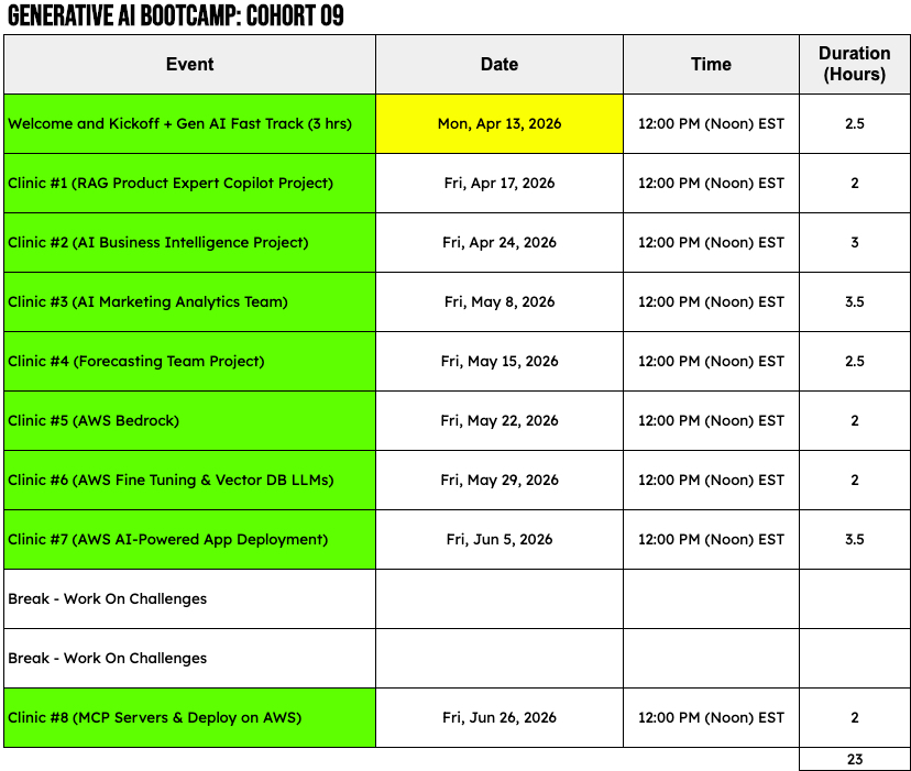 We run the Generative AI Bootcamp once per quarter (4 times per year).